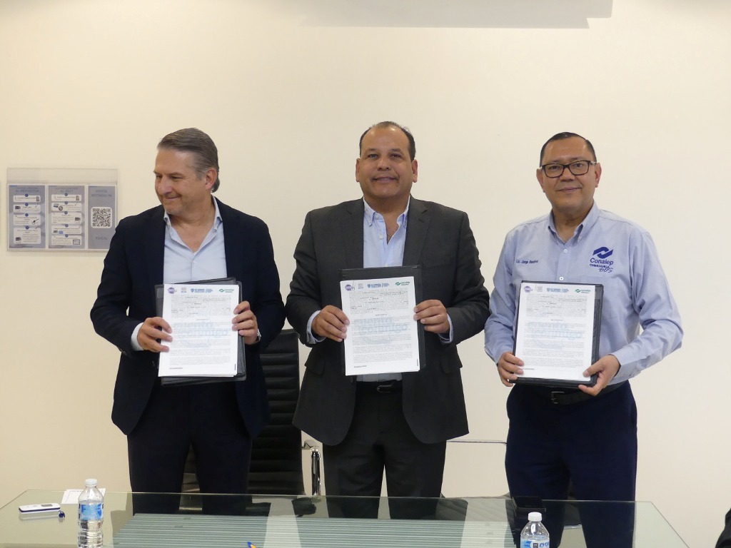 La firma de la alianza estuvo a cargo del titular del CONALEP, Omar Bazán Flores y el director general de la empresa, Francisco Santini Ramos, también estuvieron presentes los ex presidentes municipales, Gustavo Ramos Becerra y Mario de la Torre Hernández.