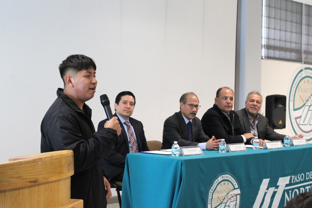 El evento protocolario contó con la participación de Joctan Abimael Roldán Cabrera, egresado del Conalep 1 y recién graduado de la Ingeniería en Mecatrónica de la UT Paso del Norte, quien compartió su experiencia como estudiante de ambos planteles.
