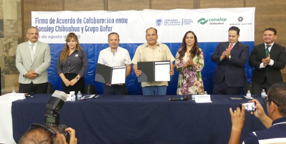 El Colegio de Educación Profesional Técnica del Estado de Chihuahua (Conalep) y Grupo Bafar firmaron un convenio para impulsar el desarrollo académico y profesional del alumnado con el programa dual, certificaciones, bolsa de trabajo y prácticas profesionales.